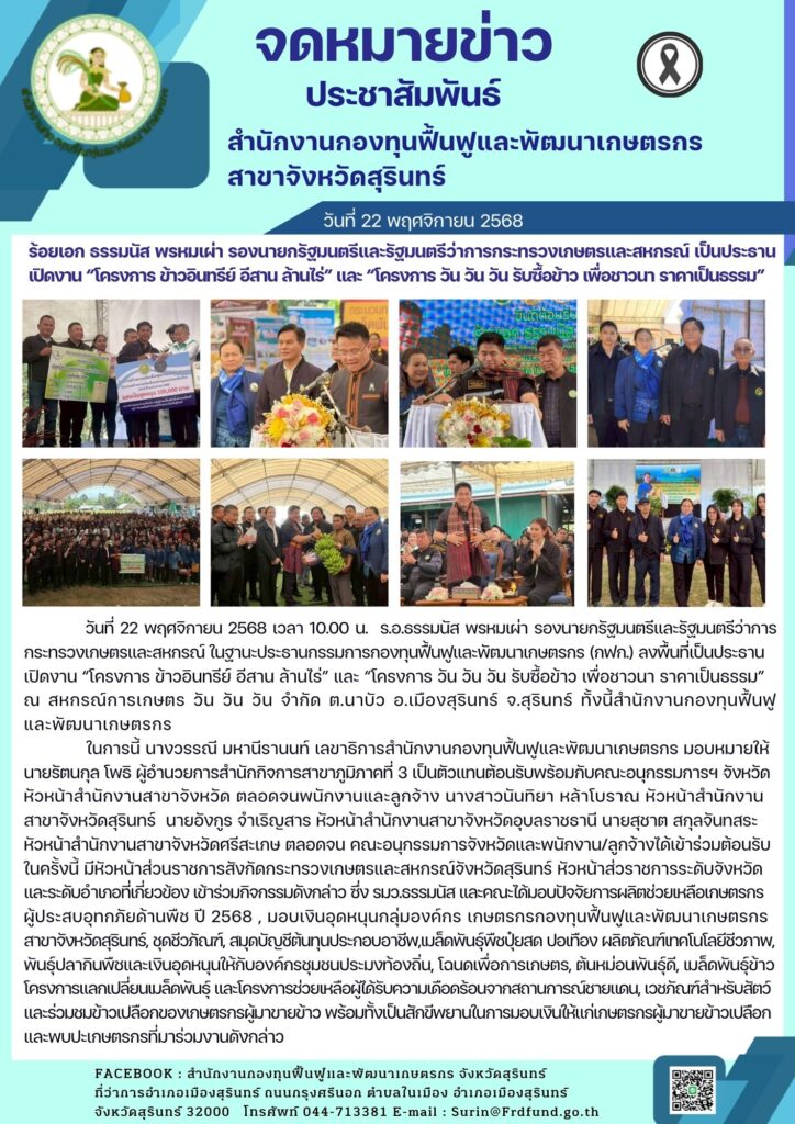 วันที่ 22 พฤศจิกายน 2568 เวลา 10.00 น. ร้อยเอก ธรรมนัส พรหมเผ่า รองนายกรัฐมนตรีและรัฐมนตรีว่าการกระทรวงเกษตรและสหกรณ์ ในฐานะประธานกรรมการกองทุนฟื้นฟูและพัฒนาเกษตรกร (กฟก.) ลงพื้นที่เป็นประธานเปิดงาน “โครงการ ข้าวอินทรีย์ อีสาน ล้านไร่” และ “โครงการ วัน วัน วัน รับซื้อข้าว เพื่อชาวนา ราคาเป็นธรรม” ณ สหกรณ์การเกษตร วัน วัน วัน จำกัด ต.นาบัว อ.เมืองสุรินทร์ จ.สุรินทร์ ทั้งนี้สำนักงานกองทุนฟื้นฟูและพัฒนาเกษตรกร